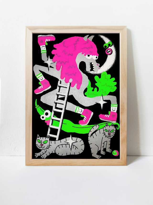 Sérigraphie 4 kooleurs 🩷 21x29,7 cm 💚 Édition numérotée & signée - 27 exemplaires 🖤 Chaque sérigraphie est imprimée artisanalement. De légers décalages ou petites traces d'impression peuvent apparaître sur certains tirages.
